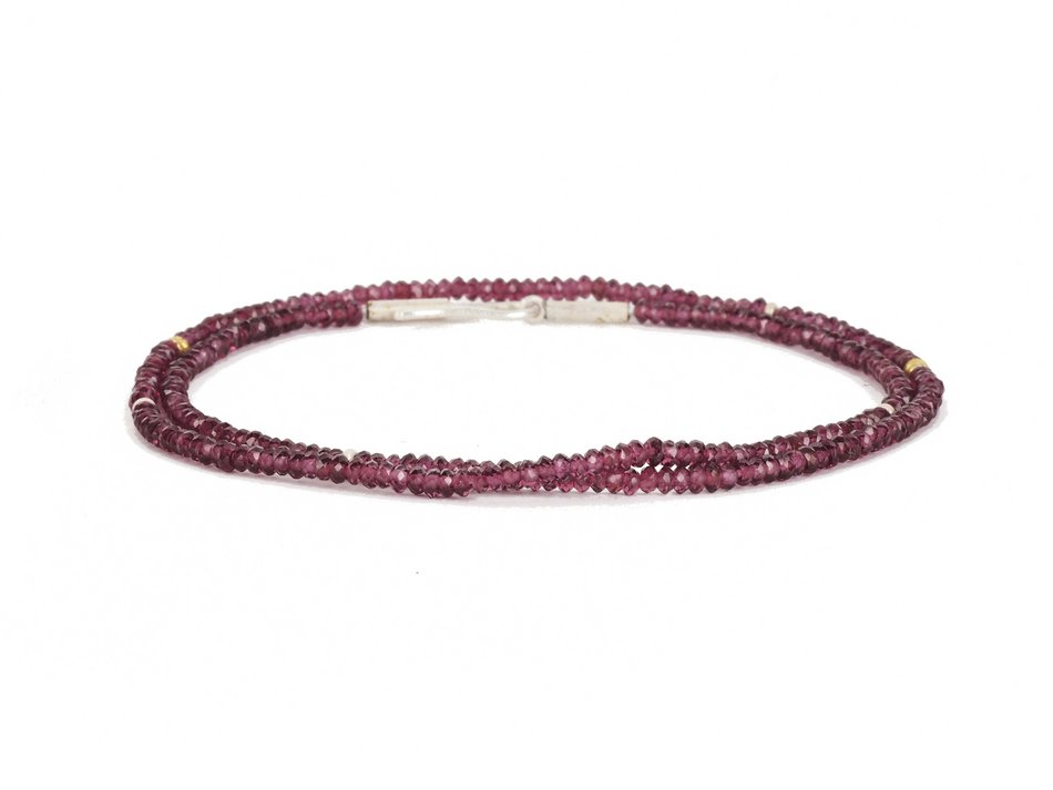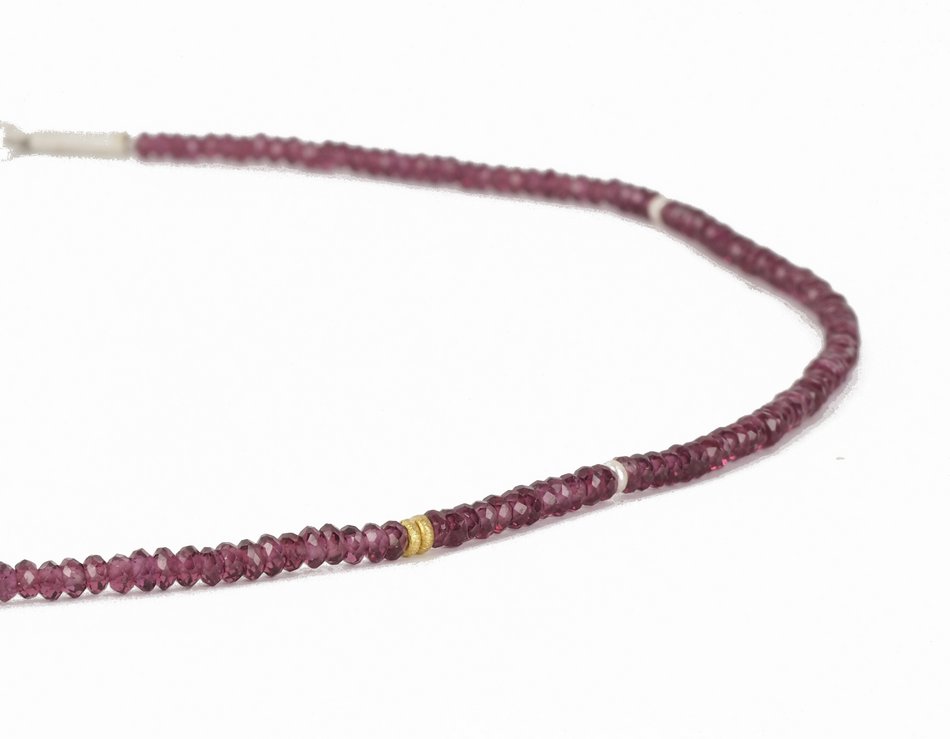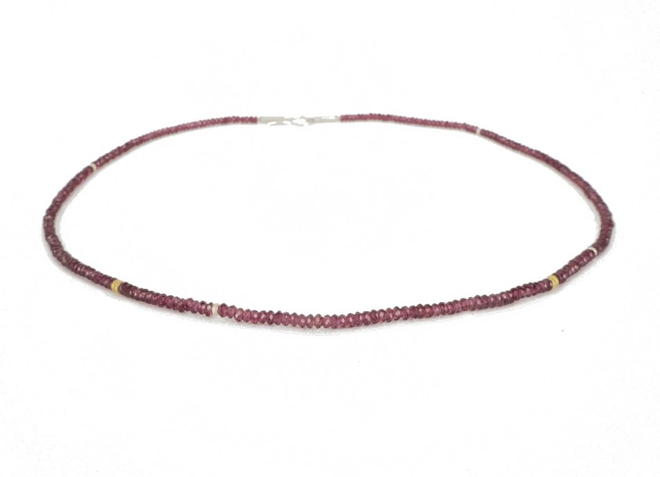 Die Kette besteht aus facettierten, feinen, Granatlinsen. Zwischendurch sind Ösen aus SIlber und hochwertigem, sattgelbem Gold eingefügt.