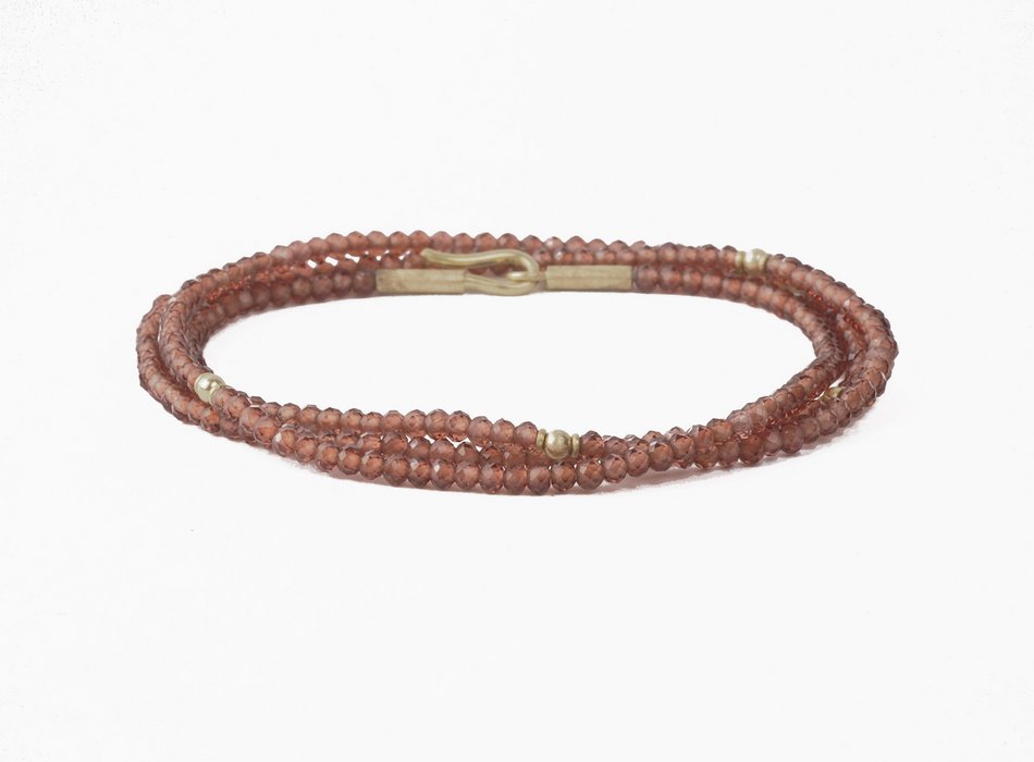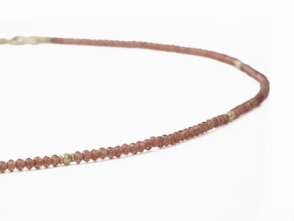Diese feine Kette besteht aus facettierten Hessonitkugeln die sehr gut geschliffen sind, so dass sie unglaublich funkeln. Dazwischen sind Elemente aus hochwertigem, sattgelbem Gold eingearbeitet. Der Verschluß ist ein handgefertigter Haken.