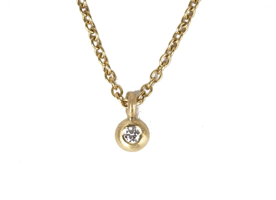 Der Anhänger ist aus hochwertigem, sattgelbem Gold gefertigt. Er besteht aus einer etwas breiteren, bauchigen Fassung in der ein funkelnder Brillant eingefasst ist. Oben ist eine Öse, durch die eine Kette durchgefädelt werden kann.