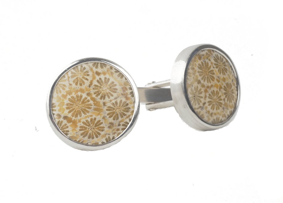 Die Manschettenknöpfe sind aus Silber und aus fossilen Korallen gefertigt. Auf den Korallen ist ein orange-braunes Blütenmuster abgebildet