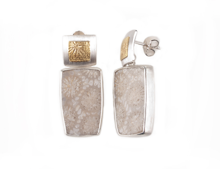die Ohrhänger bestehen aus 2 Teilen. Die oberen Teile sind konvex gewölbte Quadrate aus Silber, auf denen strukturierte, etwas kleinere Quadrate aus Gold aufgebracht sind. An den Quadraten sind hinten die Ohrstifte angelötet, so dass diese direkt am Ohrläppchen sitzen. Mit einer beweglichen Verbindung hängen untendran Platten aus fossilen Korallen, die in Silber eingefasst sind.