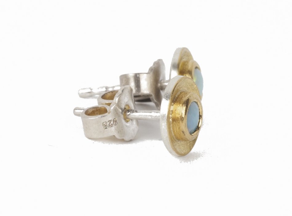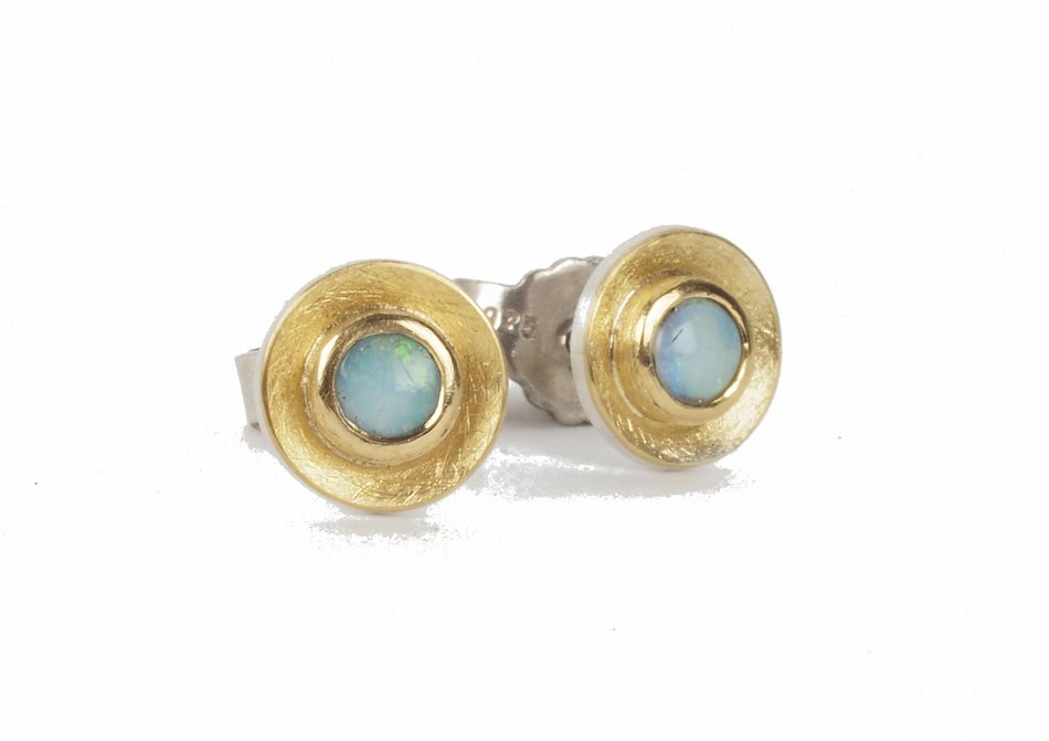 Die Ohrstecker bestehen aus konkaven Silberronden, auf die ein dünnes Blech aus hochwertigem, sattgelbem Gold aufgebracht ist. In deren Mitte sind bunt schillernde Milchopale in eine Goldfassung eingefasst. Der Ohrstift auf der Rückseite ist wie die Grundplatte aus Silber.