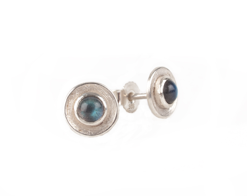 Die Ohrstecker bestehen aus konkaven Silberronden. In deren Mitte ist ein dunkelblaugrün schillernder Labradorith in einer Silberfassung eingefasst.